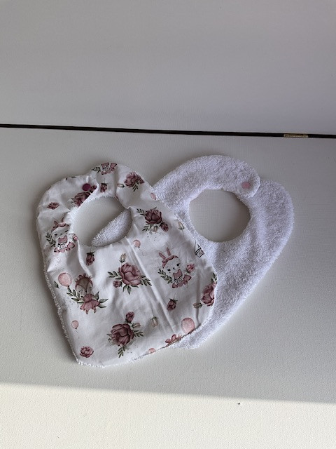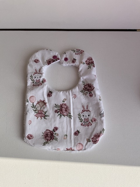 Bavoir pour bébé dès la naissance . 1 face tissu coton imprimée / 1 face éponge . Hauteur totale 27 cm , se ferme à l arrière par une  pression . Lavable en machine jusqu’à 60