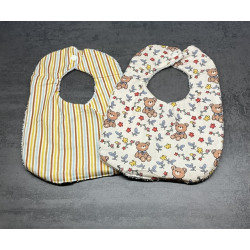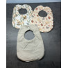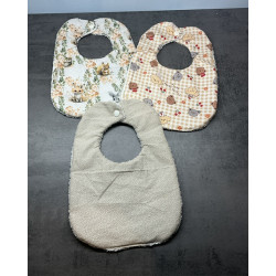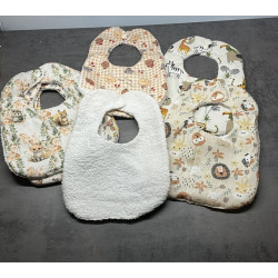 Bavoir pour bébé dès la naissance . 1 face tissu coton imprimée / 1 face éponge . Hauteur totale 27 cm , se ferme à l arrière par une pression . Lavable en machine jusqu’à 60