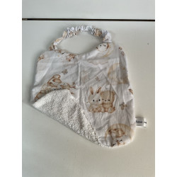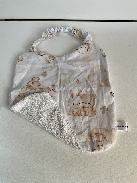 Entre bavoir et serviette de cantine idéal pour bébé à partir de 6 mois jusqu’à 2/3 ans . En tissu coton imprimé et éponge absorbant, pratique grâce à son attache élastique tour de son . Lavable en machine jusqu’à 60°.