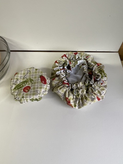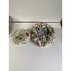 Charlottes 100% coton ( intérieur et extérieur ) , lavables en machine à 40°.Charlottes de tailles différentes pouvant s'adapter aux contenants de toutes tailles, bols, mugs, verres, assiettes, saladiers, moules à manquer ou à tarte...