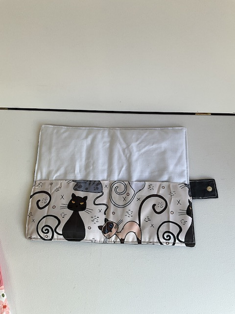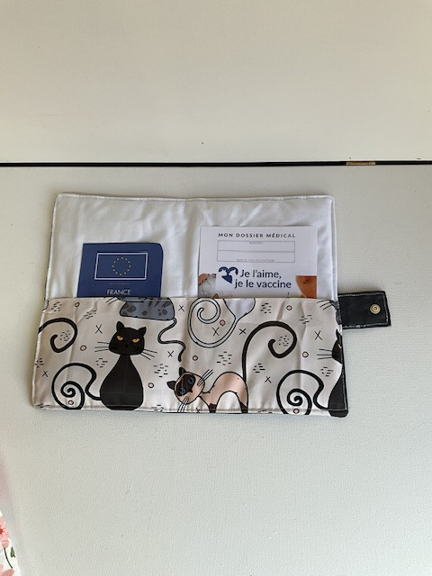 Protège carnet de santé pour animaux de compagnie afin de pouvoir ranger son carnet et ses papiers importants .mesure 24 x16 cm environ 2 poches à l intérieur de 16x 11 cm pour y glisser les papiers . Rembourré par de la ouate , se ferme par un bouton pression.