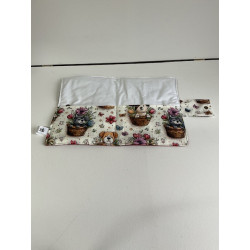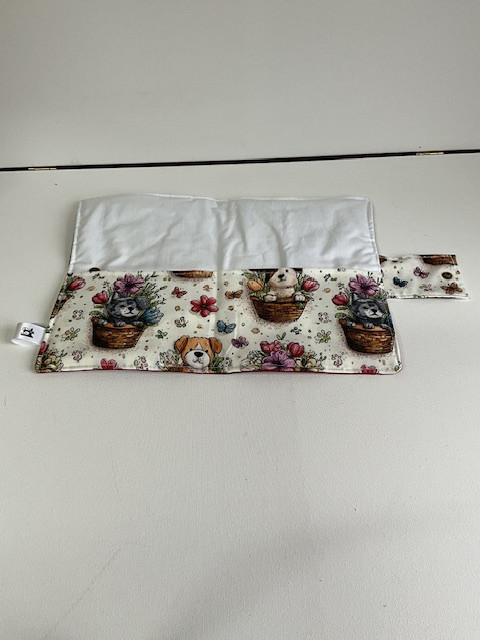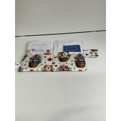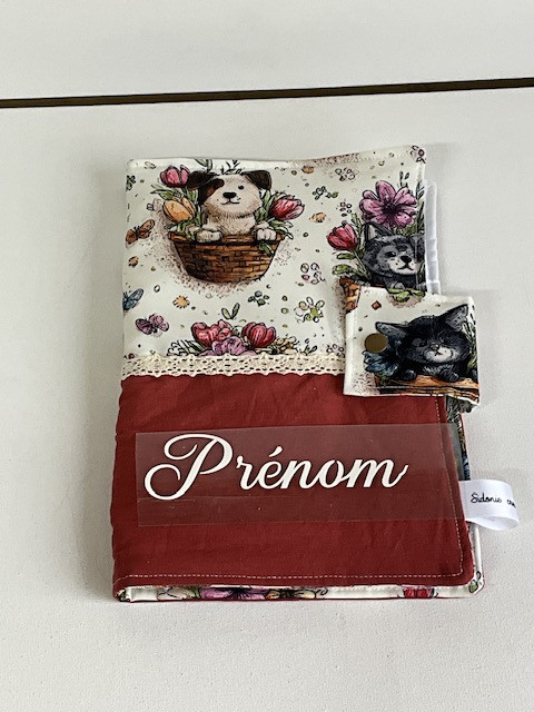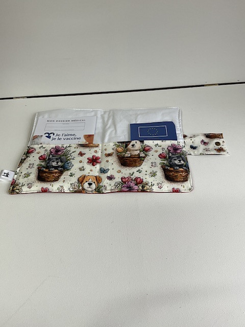 Protège carnet de santé pour animaux de compagnie afin de pouvoir ranger son carnet et ses papiers importants .mesure 24 x16 cm environ 2 poches à l intérieur de 16x 11 cm pour y glisser les papiers . Rembourré par de la ouate , se ferme par une pression . Les produits étant crée artisanalement il reste des produits uniques .