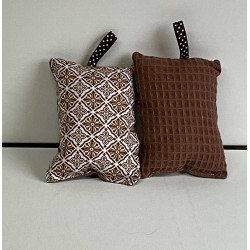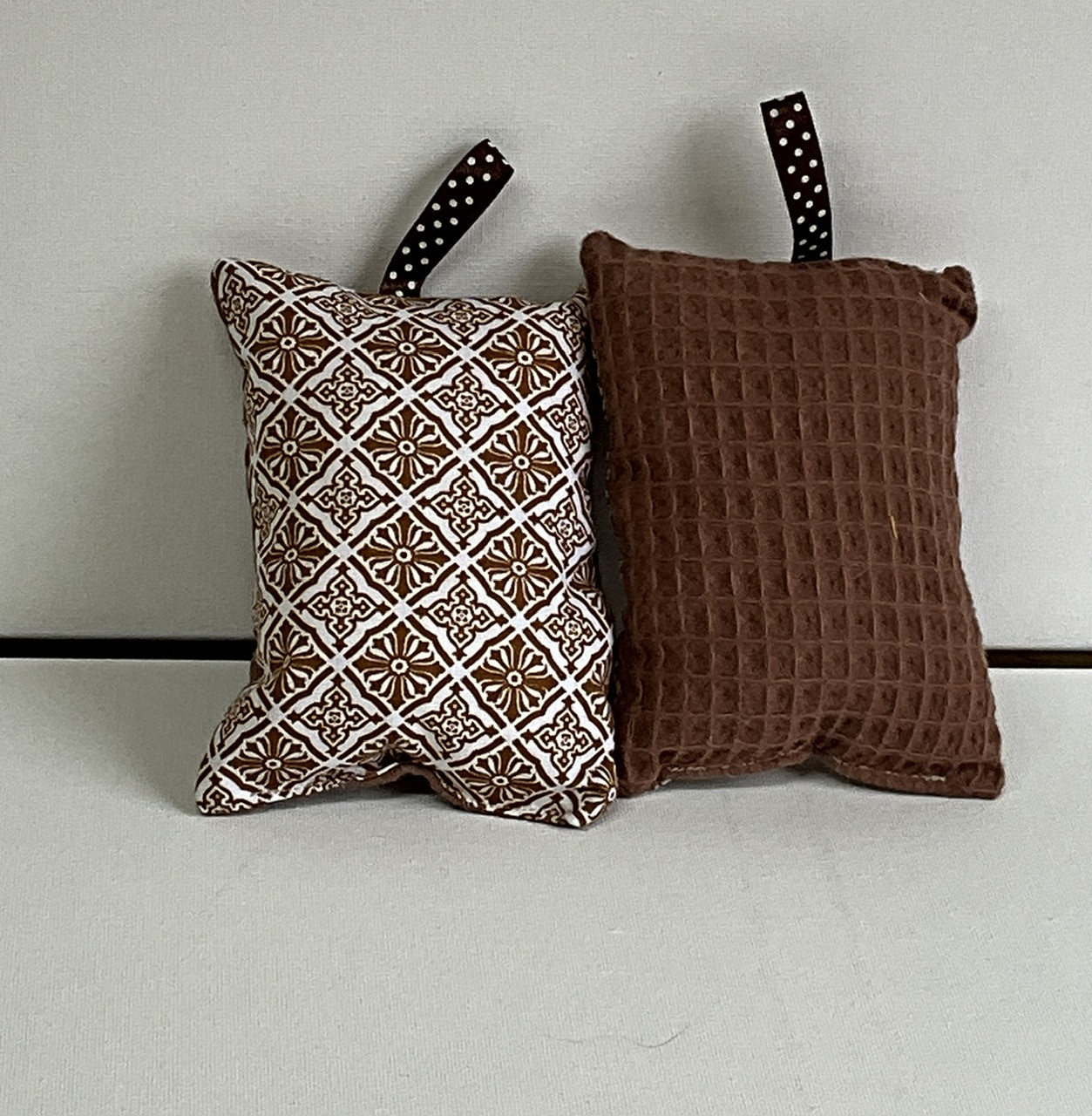 Éponges lavables en tissu imprimé et tissu nid abeille , rembourrées avec de la ouate pour une meilleure prise main . Lavable en machine à 40° .