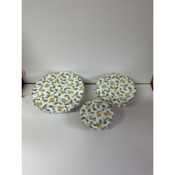 3 charlottes couvre plats : 18 cm pour les bols, 24 cm pour saladiers moyens et 32 cm pour les saladiers plus grands . S adaptent à différents diamètre de récipients ronds grâce à leur élasticité. 100% coton et lavable en machine jusqu’à 60°, une bonne alternative au film étirable plastique .