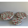 3 charlottes couvre plats : 18 cm pour les bols, 24 cm pour saladiers moyens et 32 cm pour les saladiers plus grands . S adaptent à différents diamètre de récipients ronds grâce à leur élasticité. 100% coton et lavable en machine jusqu’à 60°, une bonne alternative au film étirable plastique .