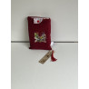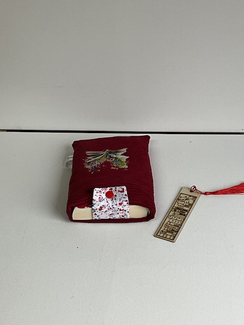 Pochette pour livre format livre de poche 15x20 cm environ . Rembourrée par une couche de ouate pour plus de protection . Se ferme par un bouton pression pour maintenir le livre . 1 marque page grave bois offert .