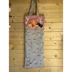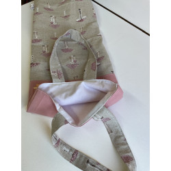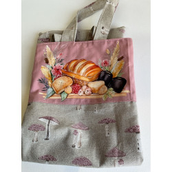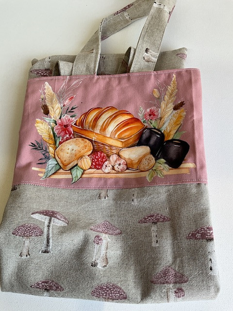 sac à pain en tissu doublé fait main . sac pouvant contenir environ 2/3 baguettes . interieur tissu blanc , extérieur tissu imprimé + dessin floqué. Largeur 25 cmx62 cm de haut .