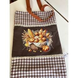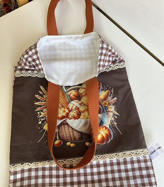 sac à pain en tissu doublé fait main . sac pouvant contenir environ 2/3 baguettes . interieur tissu blanc , extérieur tissu imprimé + dessin floqué. Largeur 25 cmx62 cm de haut .