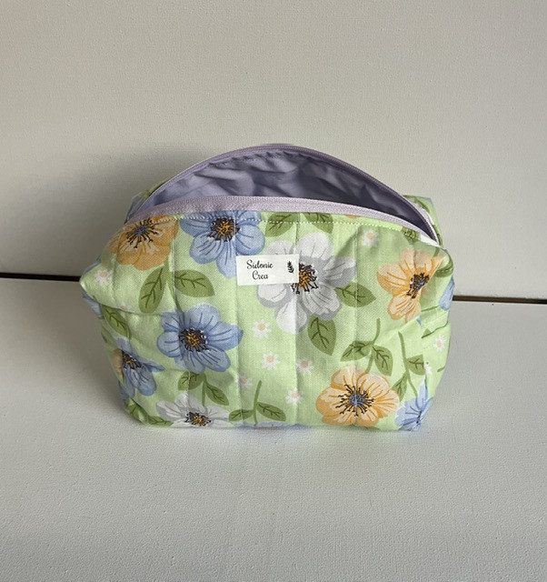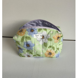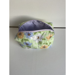 Trousse de toilette « fourre tout « extérieur en tissu imprimé et intérieur en coton uni . Pratique pour ranger maquillage ou autre.